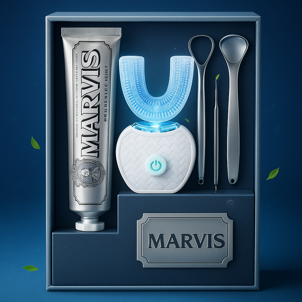 Elevate your daily oral care routine with our all-in-one Basic Kit. This set includes a premium automatic toothbrush for a thorough, effortless clean, a stainless steel tongue scraper to eliminate bad breath and bacteria, and a luxurious tube of Marvis toothpaste for long-lasting freshness. Designed for convenience and effectiveness, this kit is your first step to a healthier, brighter smile every day.